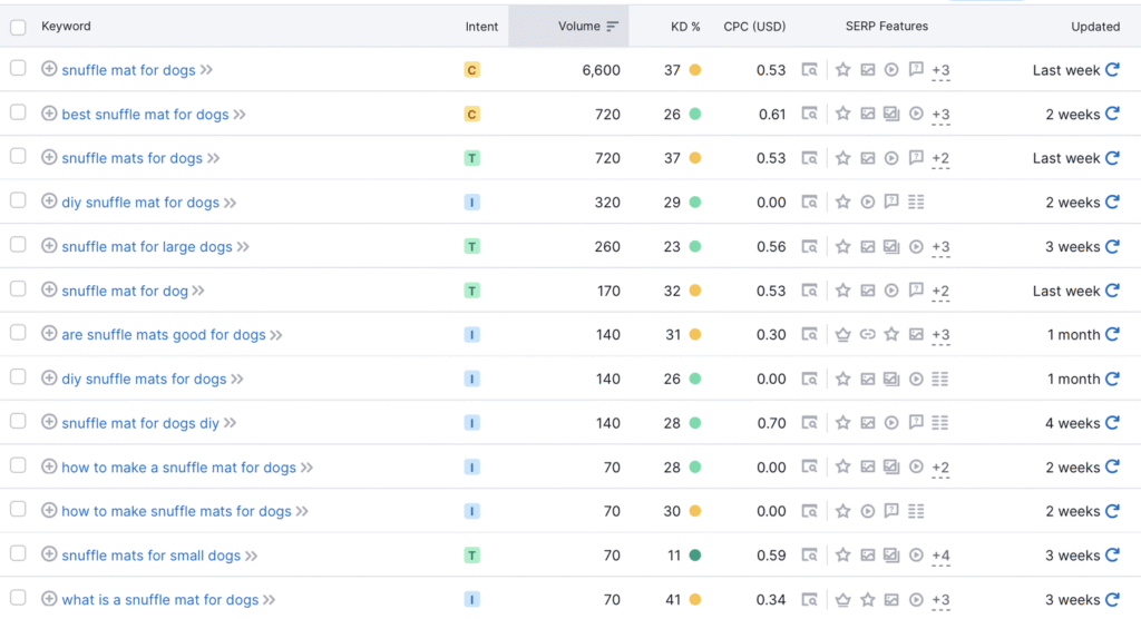 • Using a spreadsheet, map out keywords that are related to your product. This could include the product itself (snuffle mats for dogs, cat vitamins etc), problems your product solves, ingredients in your product (for ingestibles), or conditions or behaviors related to your product. Use the magic keyword tool in SEM Rush to discern which keywords have the most search volume and lowest difficulty. You’re going to track ALL of these keywords and watch your ranking improve!